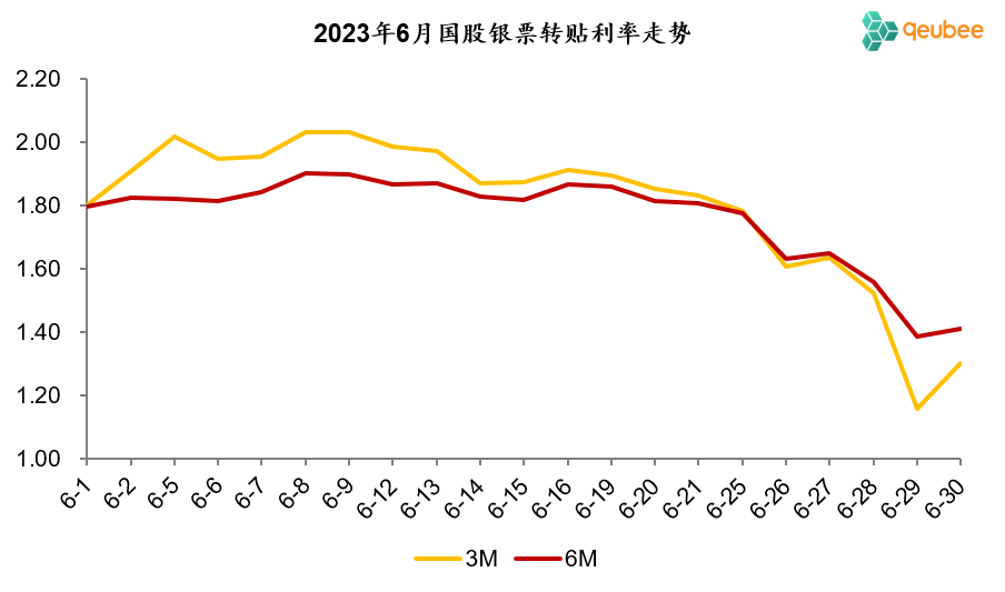 2023年6月,票据利率中上旬较为平稳,月末显著下行。6个月期限国股银票转贴现利率在1.39%-1.90%之间波动,波动幅度51BP,月内降幅39BP。月初首日票据利率高开12BP,3个月期限票据利率从6个月期限票据利率的上方来到下方。