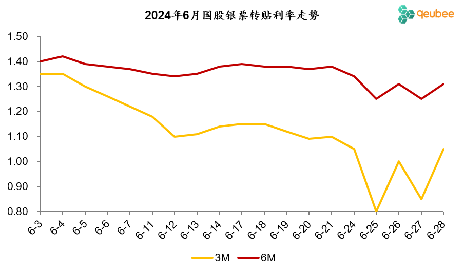2024年6月,长期限票据利率缓步下行,月末小幅跳水后震荡,短期限票据利率降幅较大。6个月期限国股银票转贴现利率在1.25%-1.42%之间波动,波动幅度17BP,月内降幅9BP。月初首日票据利率平稳开局,3个月期限票据利率显著低于6个月期限票据利率。